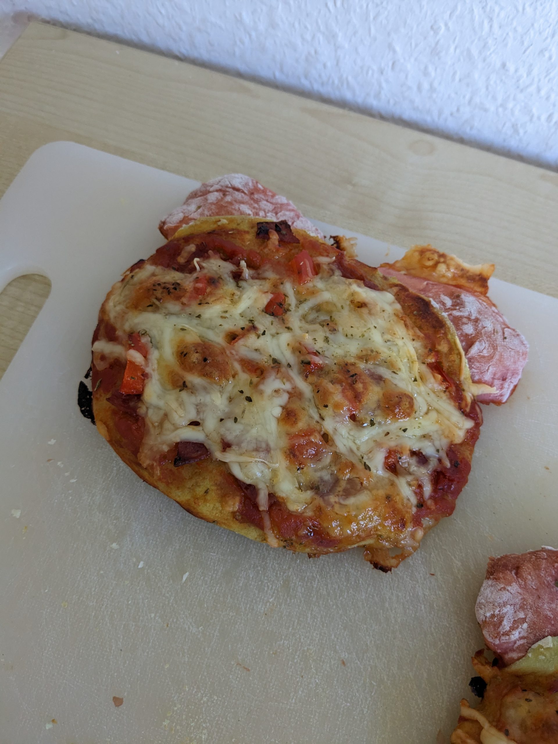 Die Pizza kann nach Gusto belegt werden. Nun im Ofen backen 220°C für 20min.