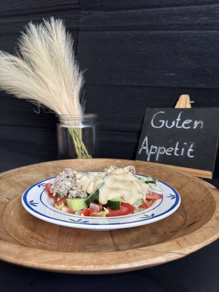 4. Zum Schluss nimmt man sich ein Teller, macht da bisschen Eisbergsalat drauf und bisschen vom Hackfleisch.