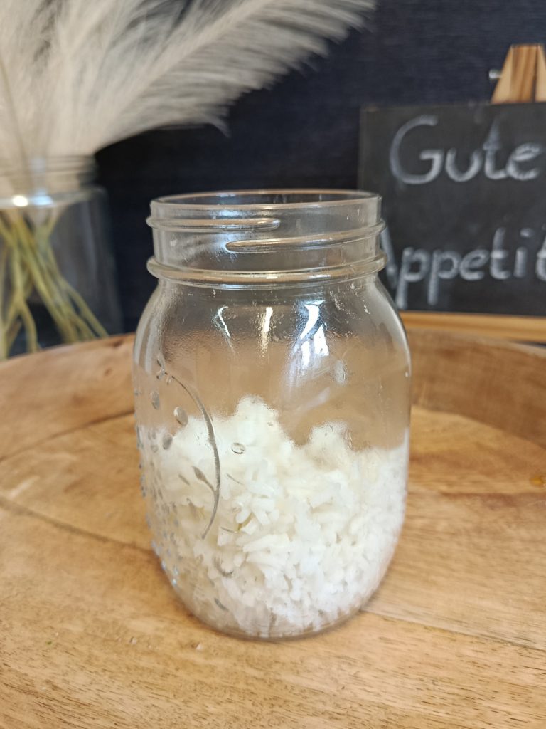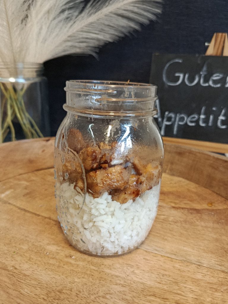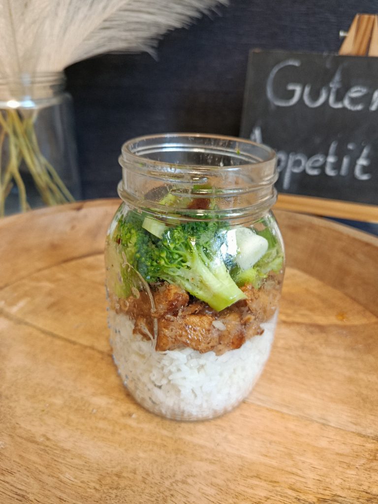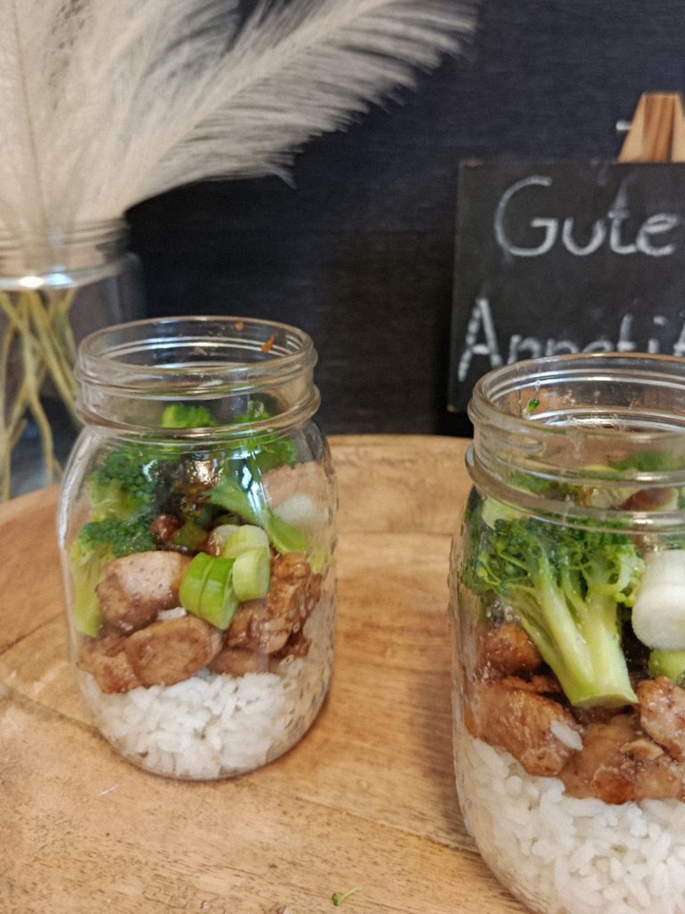 - Zum Schluss den Reis und das Hähnchen ins Glas geben und die Lauchzwiebeln und Brokkoli darüber geben. Zuletzt 1TL Sesam dazu geben.