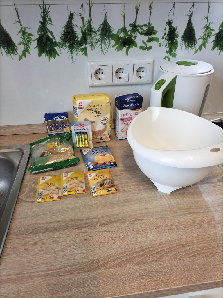 320 g Mehl (wer nicht allergisch reagiert, kann auch 50 g Mehl gegen 50 g gemahlene Haselnüsse tauschen)