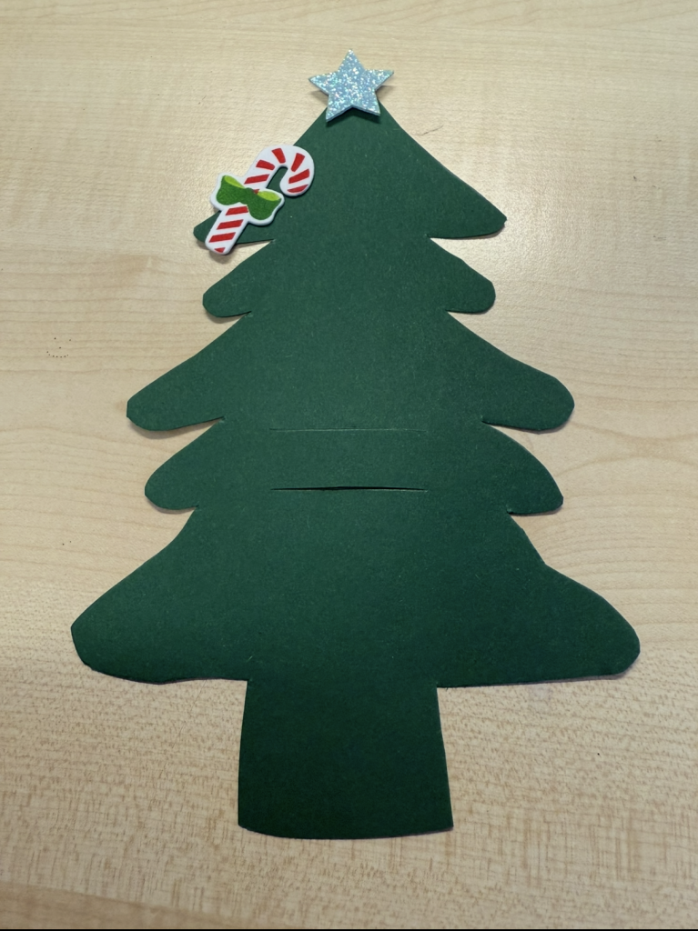 Zuerst habe ich im Internet eine passende Schablone herausgesucht und sie dann ausgedruckt. Danach habe ich mir Pappe genommen und so viele Tannenbäume aufgemalt wie ich benötige. Nun habe ich alle Bäume ausgeschnitten, meine Unterlage genommen und mit einem Cuttermesser in der Mitte des Baumes zwei gleich lange Schnitte gemacht, sodass eine Tasche für das Besteckt entsteht. Zum Schluss habe ich mit dem Stift in die Mitte noch frohe Weihnachten geschrieben und mit den Stickern die Bäume verschönert.