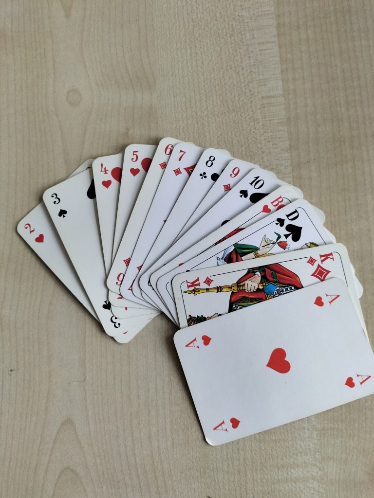 Sie benötigen 108 Spielkarten, die aus 2 französischen Kartenspielen gewonnen werden, zwei Blätter zu je 52 Karten und vier Joker.