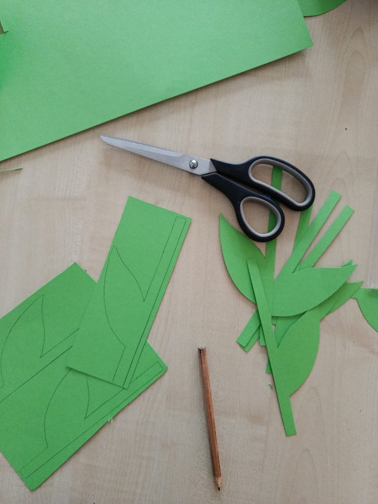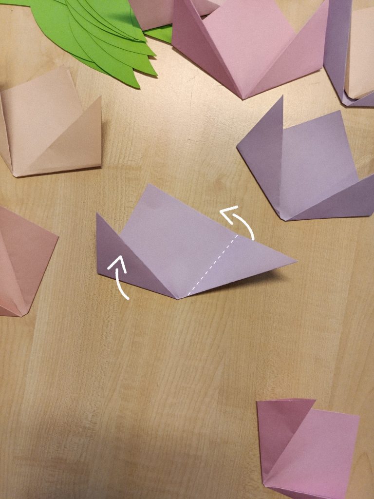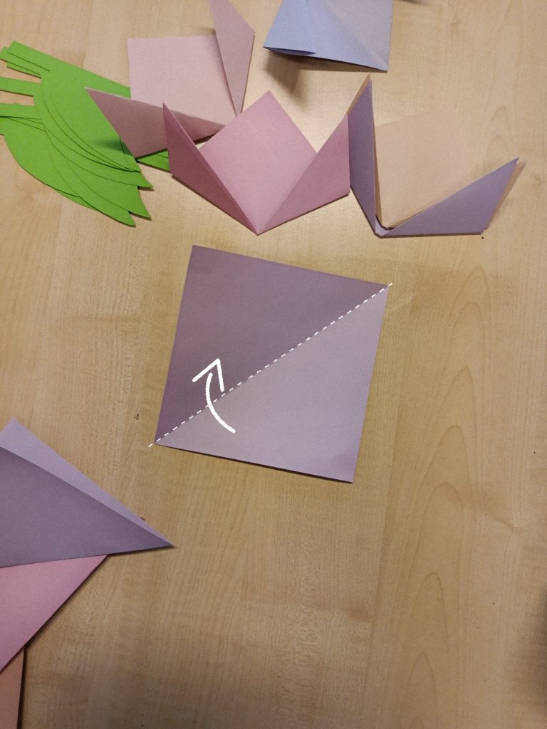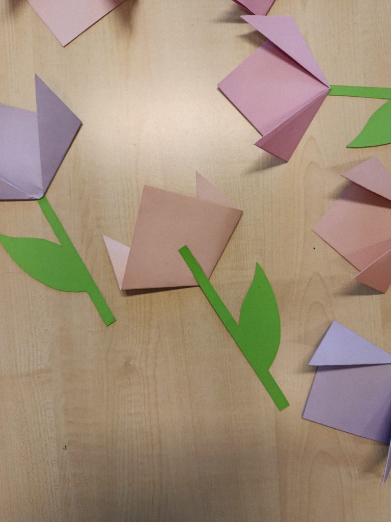 Für die Tulpen habe ich viereckiges Bastelpapier genommen und dieses einmal diagonal zu einem Dreieck gefaltet. Dieses habe ich dann ein weiteres Mal an den Ecken gefaltet. Schließlich mit dem Stängel zusammengeklebt und auch am Fenster angebracht.