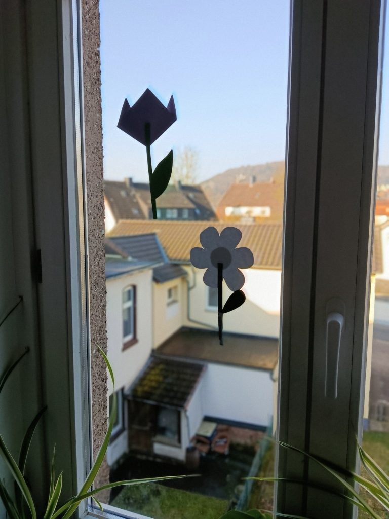 Der Frühling steht vor der Tür. Für die Fensterdekoration habe ich mich entschieden, Blumen zu basteln. Ich habe eine Vorlage erstellt und diese dann auf farbigem Bastelpapier ausgeschnitten. Hiernach habe ich alles mit einfachem Bastelkleber zusammengeklebt und mit Klebestreifen an den Fenstern angebracht.