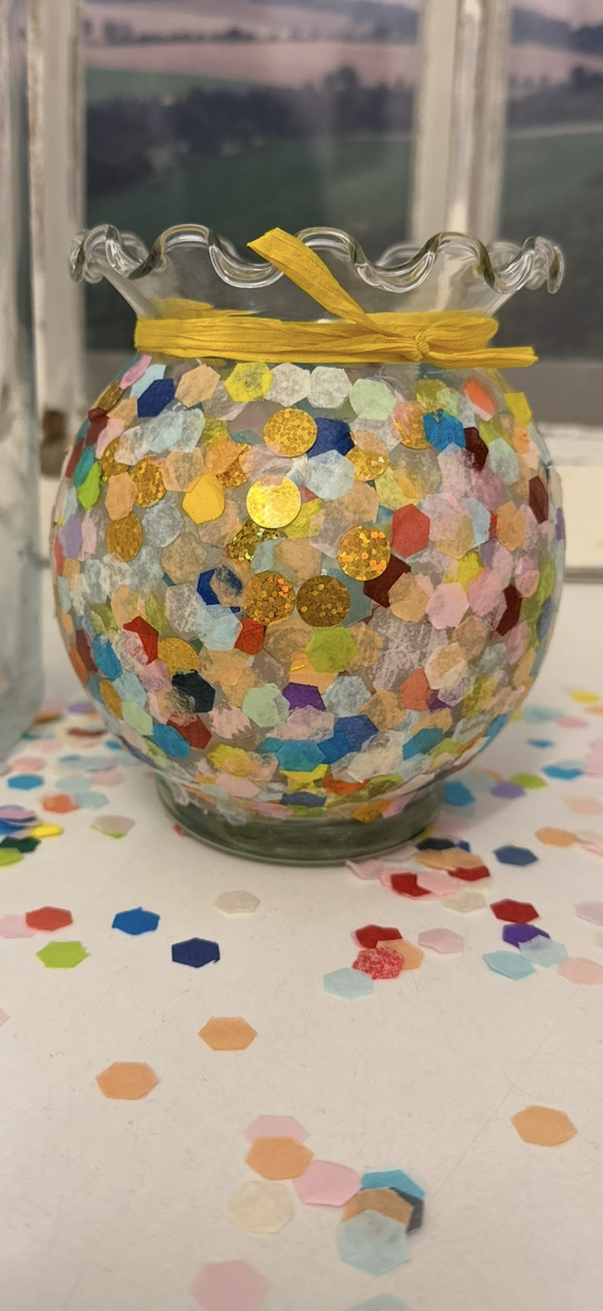 1. Zuerst habe ich das Glas mit Kleber eingestrichen und anschließend das Konfetti mit dem Pinsel einzeln draufgeklebt.