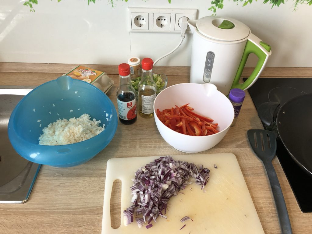 Bei der Zubereitung eines Reisgerichtes haben wir uns verschätzt und zu viel Reis gekocht. Bevor er weggeworfen wird, gibt es ein super Rezept, das vorgekochten Reis verwendet – Egg fried rice.