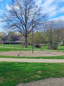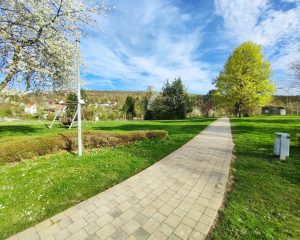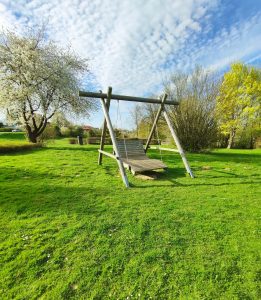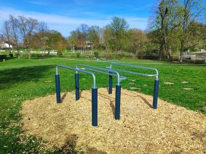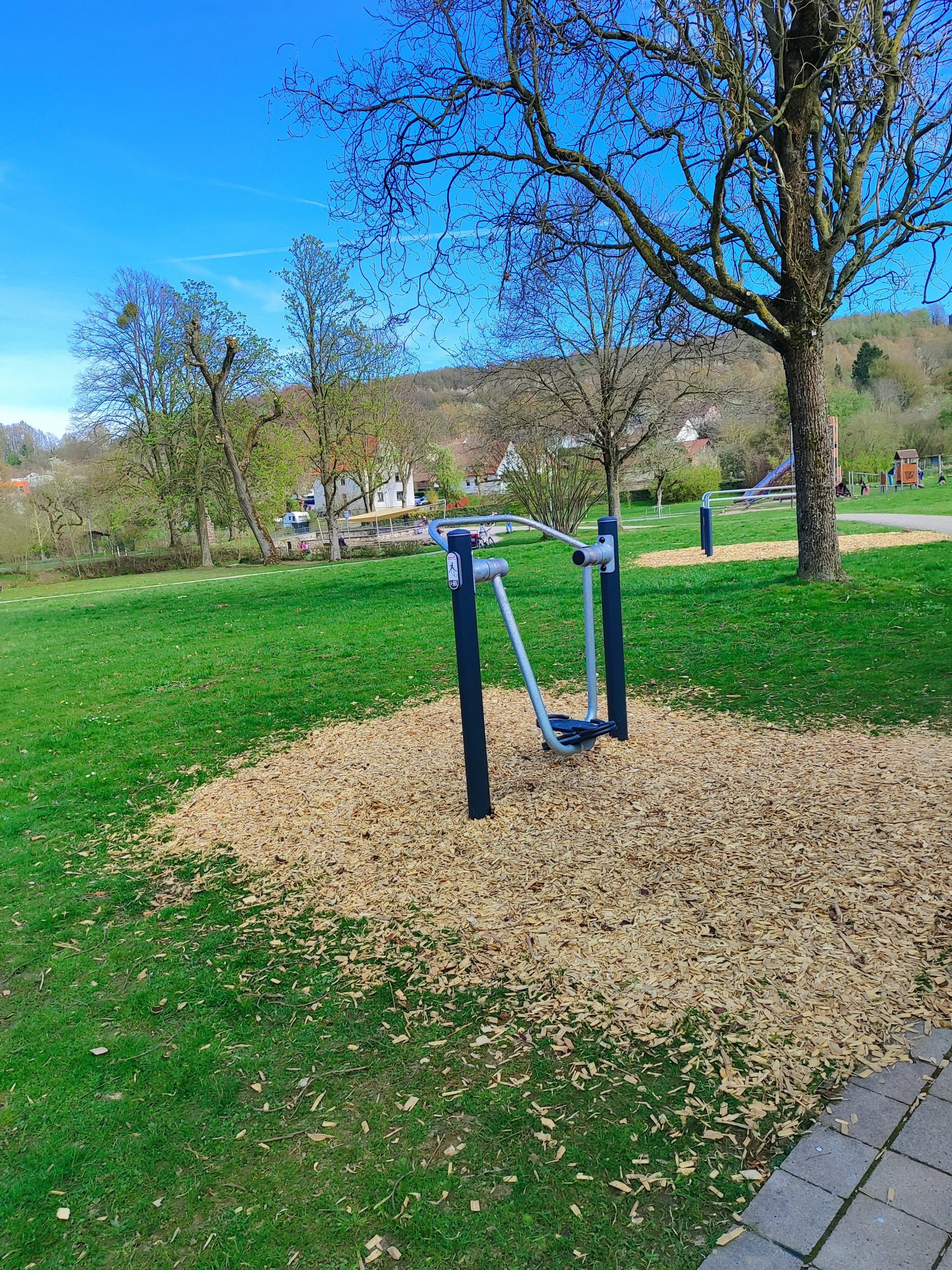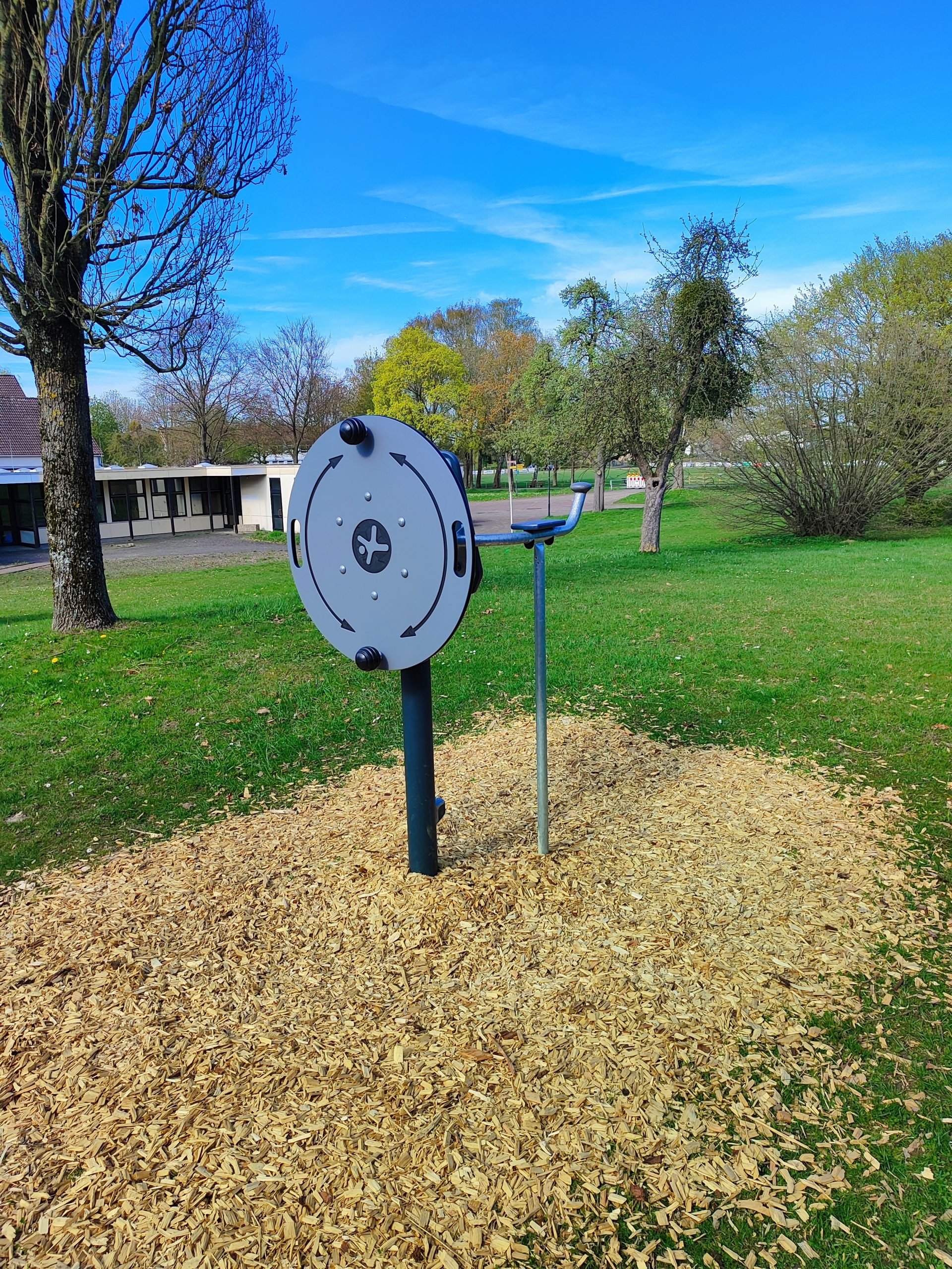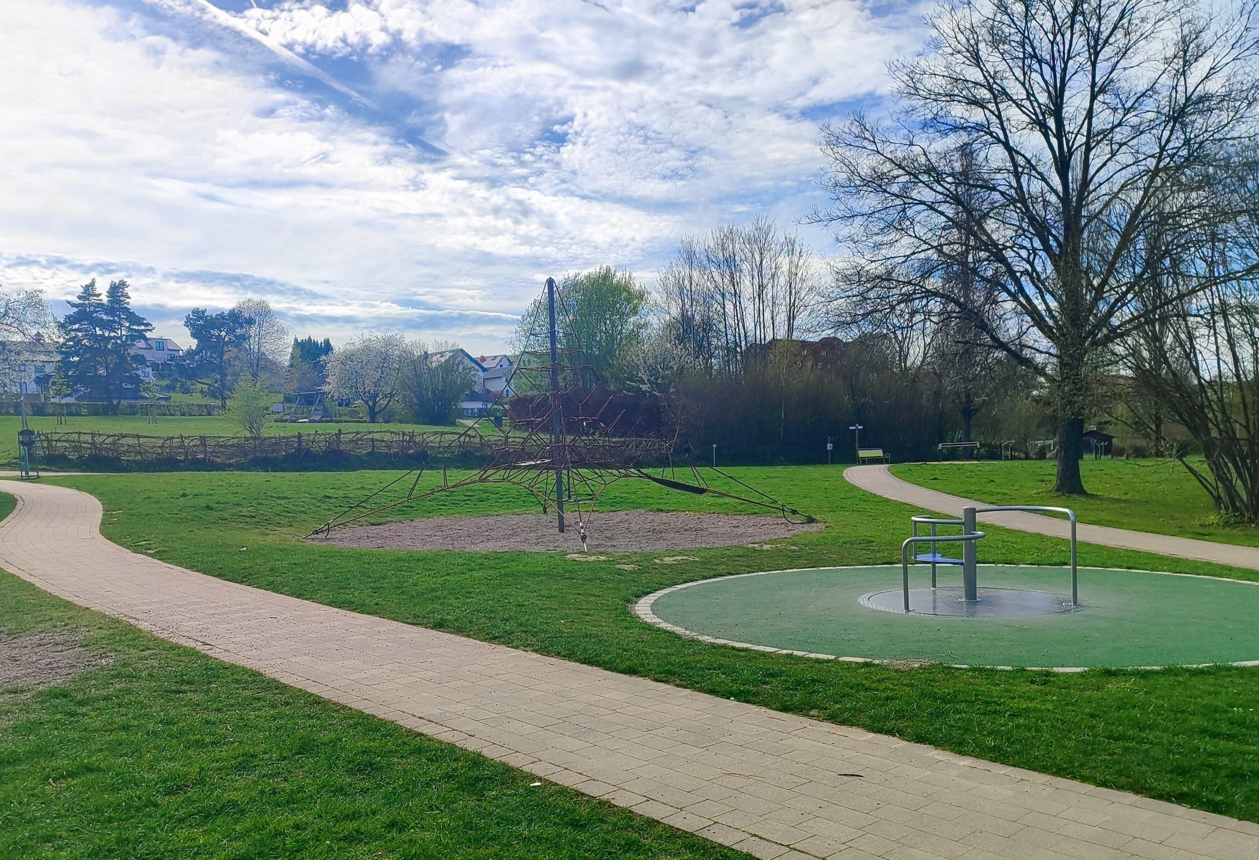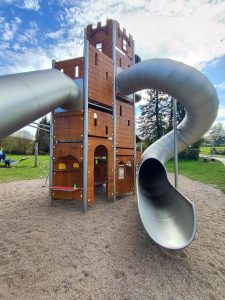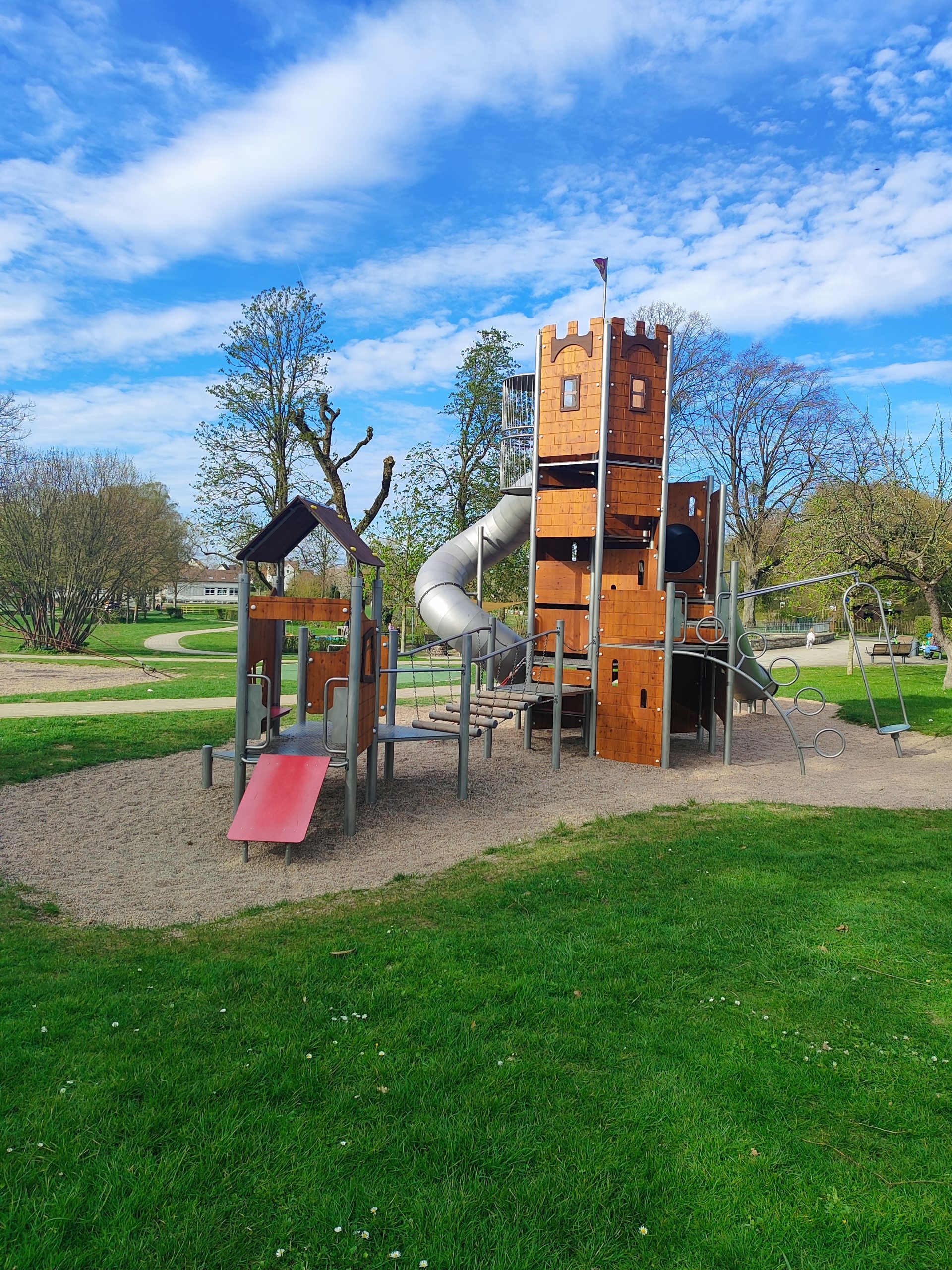 Dort gibt es einen großartigen Spielplatz für die Kinder, ein Spielturm mit Steinblock-Optik, Ausgucken, Rundbogentoren und Burgzinnen ist hier eine hochmittelalterliche Spielwelt. Abwärts führen zwei Edelstahlrutschen, die für unterschiedliche Altersklassen vorgesehen sind.