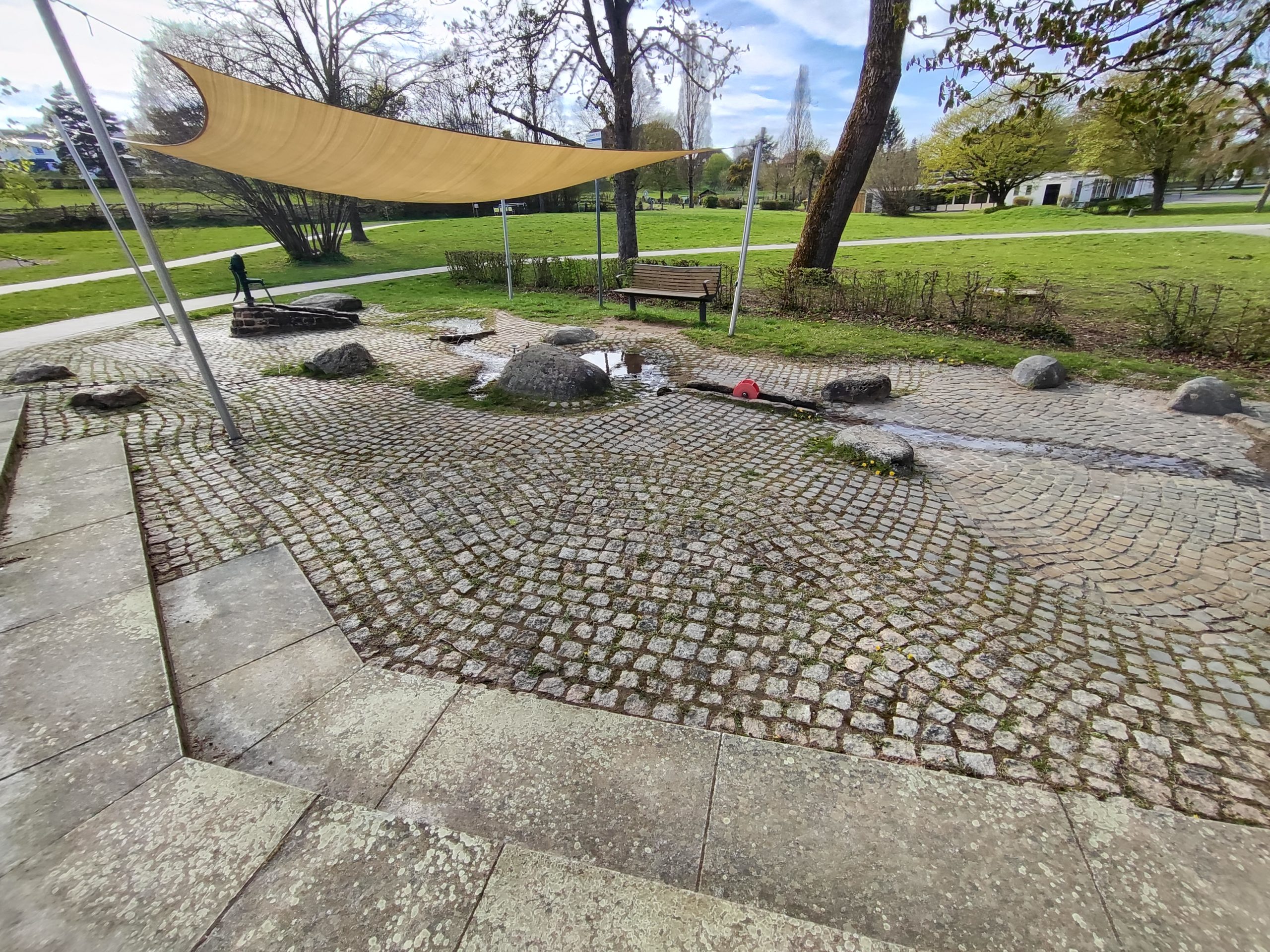 Der Wasserspielplatz sorgt bei jedem Wetter für einen Riesenspaß. Die Pumpe befördert Wasser aus der Nikolausquelle und ist besonders bei Kindern beliebt, um im Matschbereich zu spielen. Die Nikolausquelle stellt eine Besonderheit dar: Aus der Quelle sprudeln 25 Liter pro Sekunde, das Wasser ist stark kohlensäurehaltig. Aus diesem Grund wachsen hier Algen und Wasserpflanzen besonders gut.